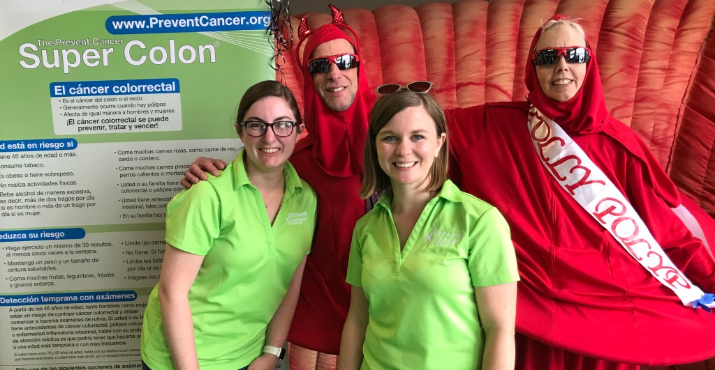 After Anita survived cancer, she created Colon STARS, a nonprofit corporation with the mission to save lives by educating people on the importance of colorectal cancer screening. They have their own inflatable walk-through colon, along with the two Polly Polyp costumes which Anita graciously offered to package and ship to us for our colon cancer prevention fair. She’s full of creative ideas. Poop emoji door prizes. Toilet paper displays to “wipe out colon cancer.” A bowl of chocolate candy with a sign that reads, “Take a tootsie, but make sure yours is checked!”